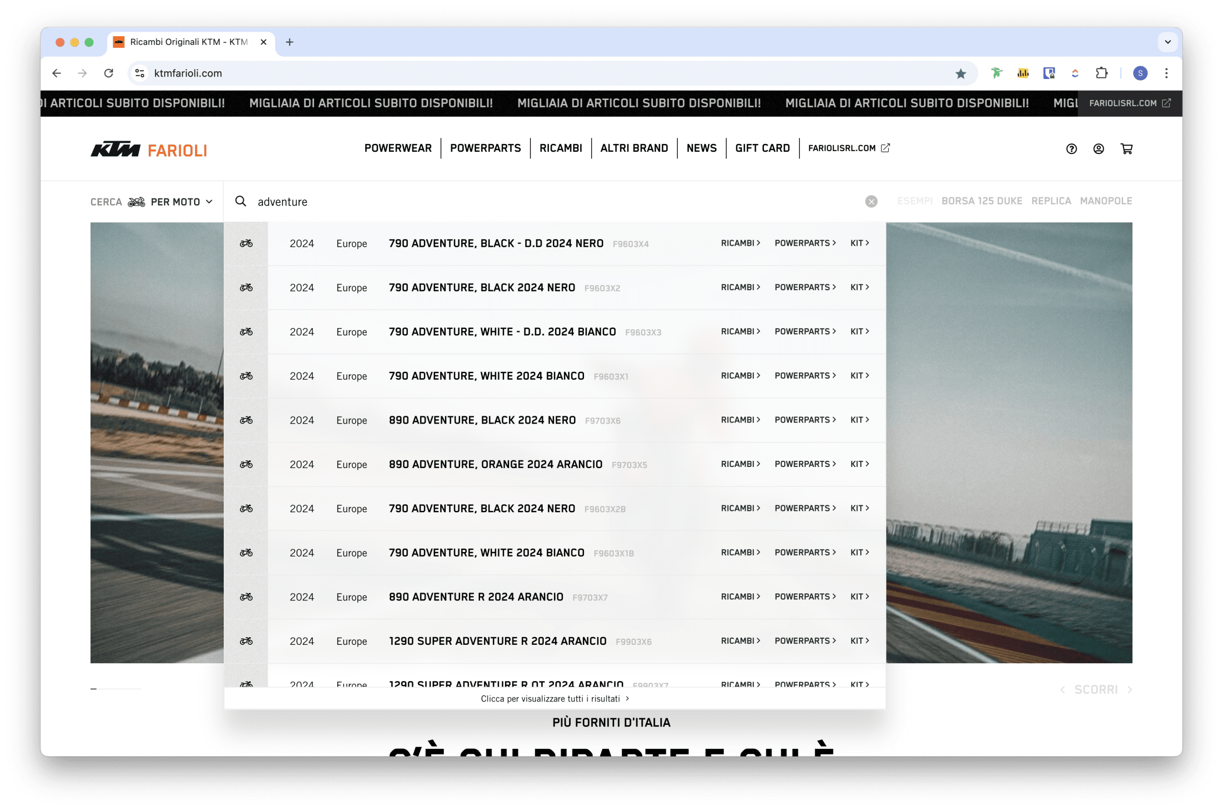 Seleziona l’opzione di ricerca per moto dalla tendina e scrivi il nome della tua moto, tipo “KTM 1290 2024”, “390 Adventure” o “EXC 250”. Fatto.