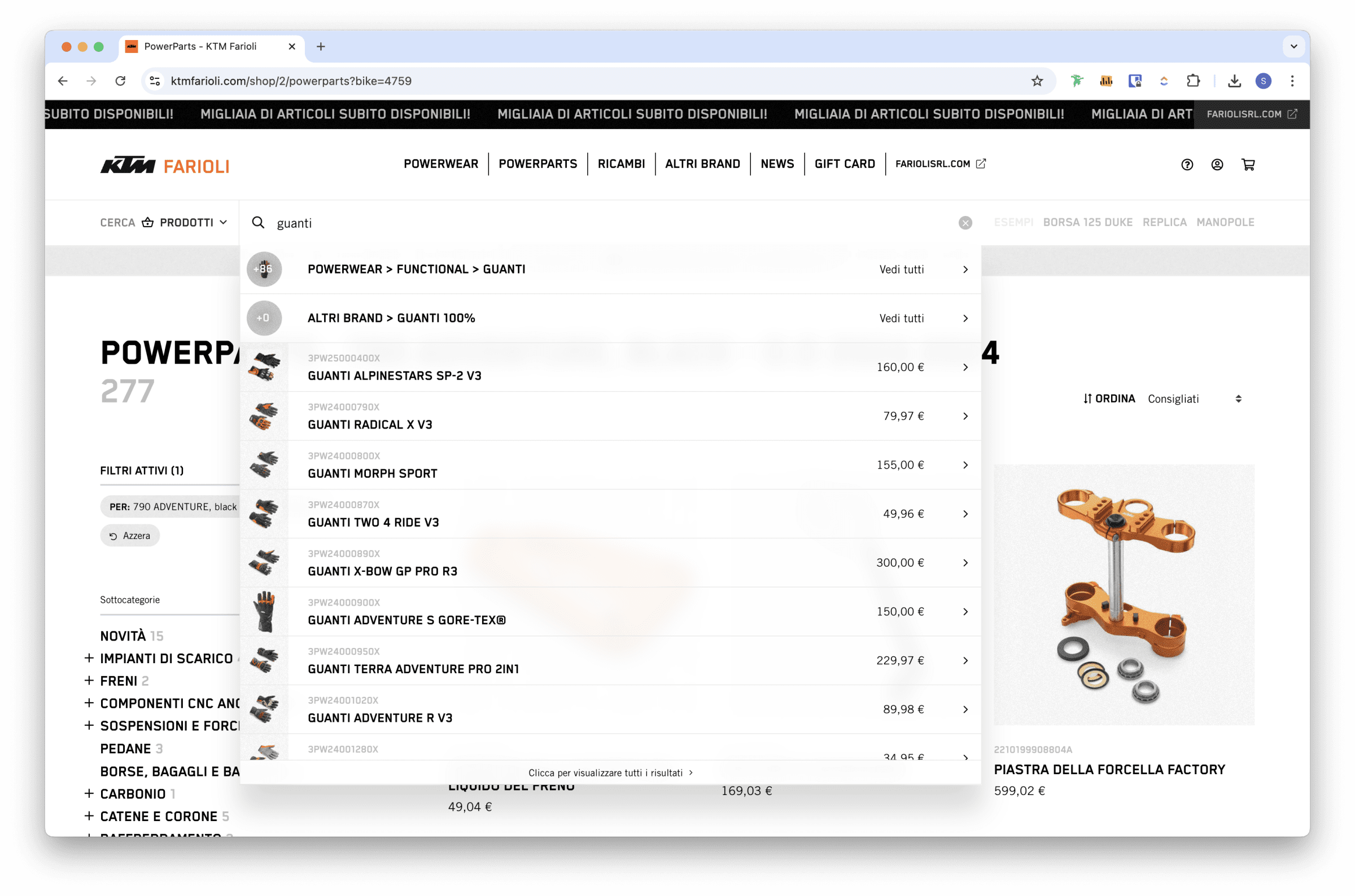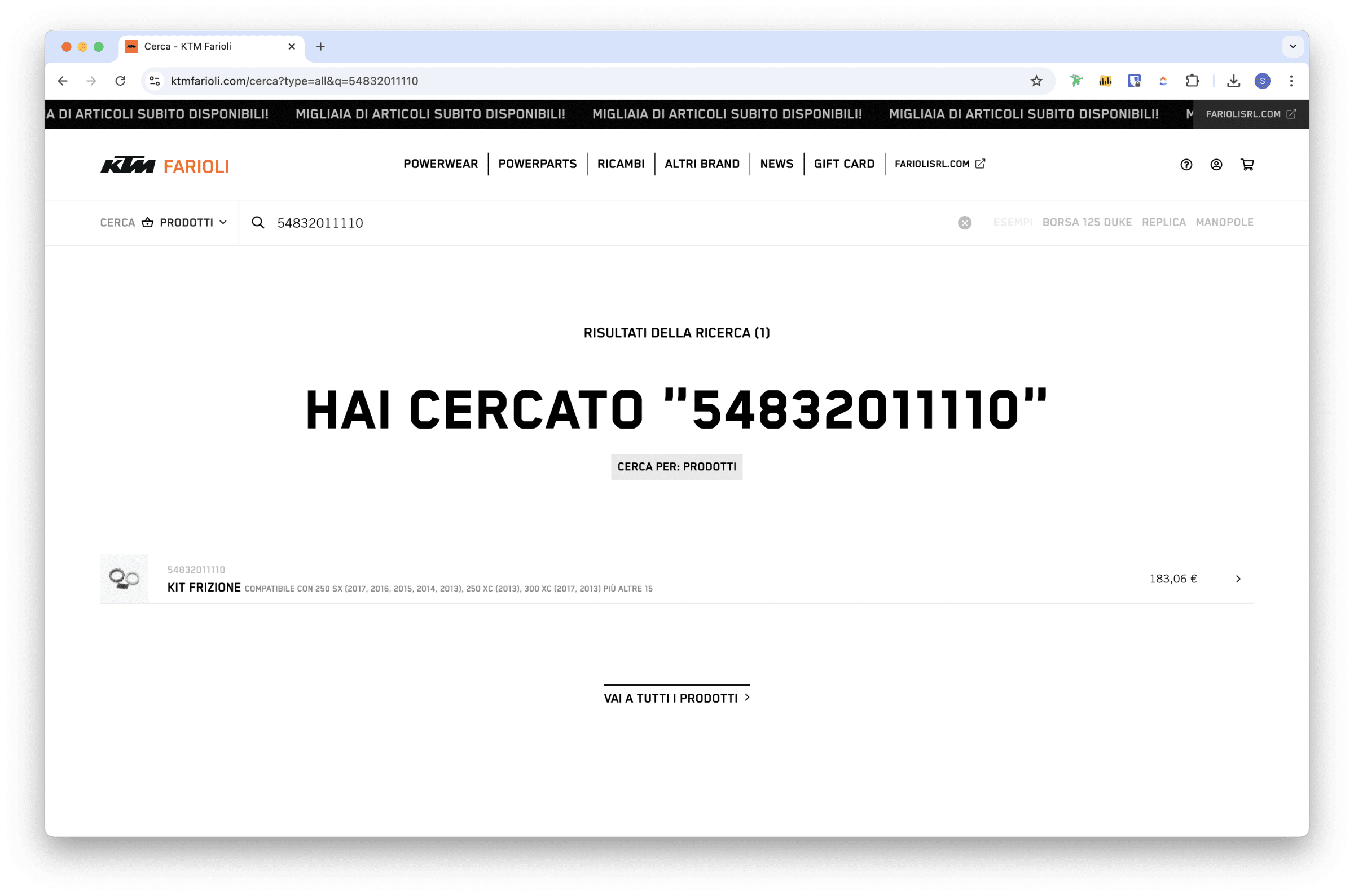 Se sei uno di quelli che va dritto al punto, qui giri in casa. Digita “sella 125 duke”, “casco”, “t-shirt Redbull”, “maglia donna”, “dischi freno 690” o “pastiglia 125”. Il cerca capisce cosa vuoi e ti mostra solo i prodotti rilevanti.